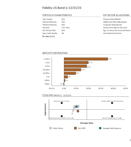 Fidelity US Bond Ix 12/31/23 PORTFOLIO CHARACTERISTICS N/A Avg. Coupon N/A Nominal Maturity N/A Effective Maturity 5.97 Years Duration N/A SEC 30 Day Yield AA Avg. Credit Quality No data found. MATURITY DISTRIBUTION 5-10Yrs 1-3Yrs 3-5Yrs 10-20Yrs 20-30Yrs 2.9% <1Yr 0.7% >30Yrs -0.3 % Other 0.0% -10.0 % (06/01/11 - 12/31/23) STYLE MAP Barclays Capital 1-5 Yr Gov Capitalization Barclays Capital U.