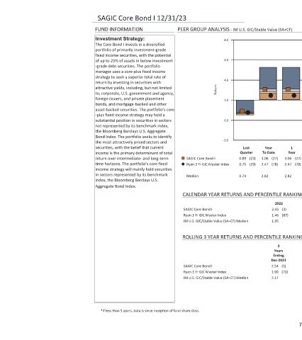 SAGIC Core Bond I 12/31/23 FUND INFORMATION Investment Strategy: The Core Bond I invests in a diversified portfolio of primarily investment-grade fixed income securities, with the potential of up to 25% of assets in below investment -grade debt securities. The portfolio manager uses a core-plus fixed income strategy to seek a superior total rate of return by investing in securities with attractive yields, including, but