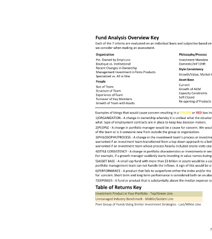 Fund Analysis Overview Key we consider when making an assessment. Organization Pct. Owned by Employee Boutique vs. Institutional Recent Changes inOwnership Management Investment inFirms Products Specialized vs. All in One People Size of Team Structure of Team Experience ofTeam Turnover of Key Members Growth of Team withAssets what type of employment contracts are in place to keep key decision