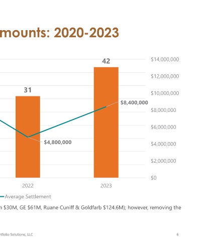 ◼ 2023 Note: The average was influenced by three large settlements (Verizon $30M, GE $61M, Ruane Cuniff & Goldfarb $124.6M); however, removing the