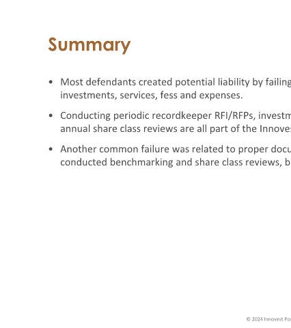 • Most defendants created potential liability by failing to execute a prudent process to monitor