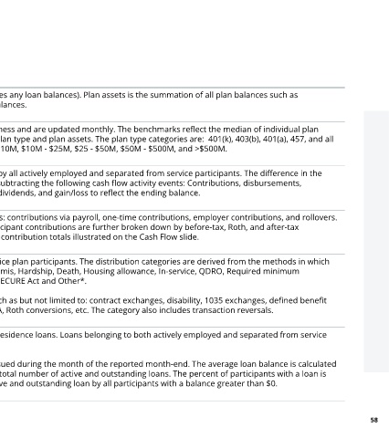 results for a population of similar plans based on the combination of plan type and plan assets. The plan type categories are: 401(k), 403(b), 401(a), 457, and all