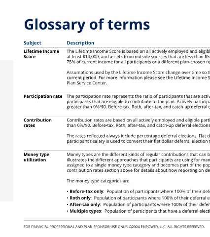 Lifetime Income The Lifetime Income Score is based on all actively employed and eligible participants that meet the following criteria: Date of birth on file, valid annual salary of
