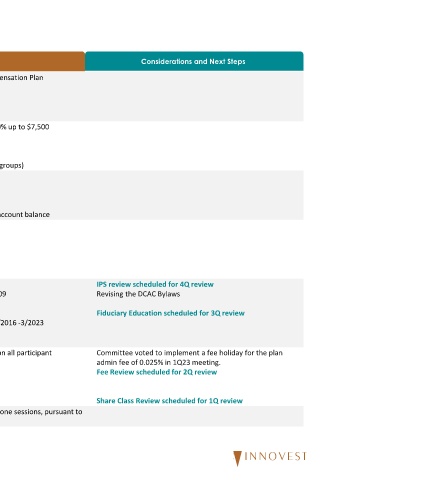 Considerations and IPS review scheduled for 4Q review Revising the DCAC Bylaws Fiduciary Education scheduled for 3Q review Committee voted to implement a fee holiday for the plan admin fee of 0.025% in 1Q23 meeting. Fee Review scheduled for 2Q review Share Class Review scheduled for 1Q review