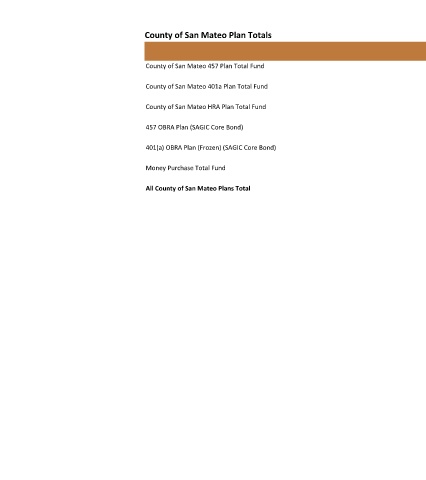County of San Mateo Plan Totals Sep-2024 Jun-2024 ($) ($) 819,489,493 777,458,545 County of San Mateo 457 Plan Total Fund 18,021,195 16,488,962 County of San Mateo 401a Plan Total Fund 4,388,804 3,746,070 County of San Mateo HRA Plan Total Fund 17,837,248 17,457,752 457 OBRA Plan (SAGIC Core Bond) 8,844,775 8,936,275 401(a) OBRA Plan (Frozen) (SAGIC Core Bond) 3,949,892 3,842,618 Money Purchase Total Fun
