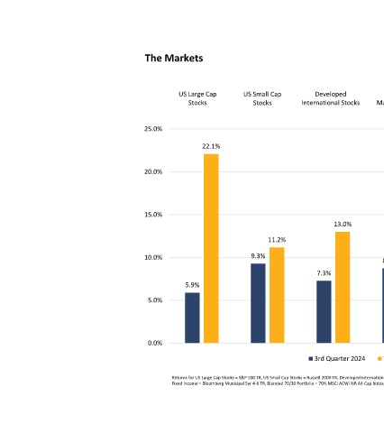 Developed Blended 70/30 Municipal Fixed Core Fixed Emerging Portfolio Income Income Markets Stocks International Stocks 16.9% 13.8% 13.0% 8.7% 7.3% 6.4% 5.2% 4.4% 3.0% 2.2% YTD as of September 30, 2024 3rd Quarter 2024 Returns for US Large Cap Stocks = S&P 500 TR, US Small Cap Stocks = Russell 2000 TR, Developed International Stocks = MSCI EAFE NR, Emerging Markets Stocks = MSCI EM NR
