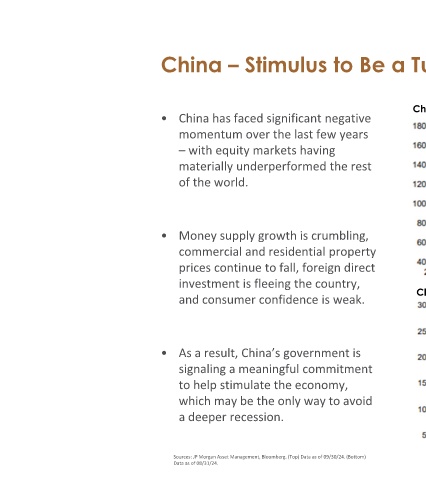 China – Stimulus to Be a Turning Point? China Stock Market Underperformance China has faced significant negative • momentum over the last few years –with equity markets having materially underperformed the rest of the world. •Money supply growth is crumbling, commercial and residential property prices continue to fall, foreign direct investment is fleeing the country, China’s M2 Money Supply, Y/Y Change and