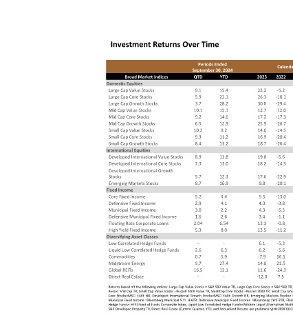 Periods Ended September 30, 2024 YTD QTD 15.4 9.1 22.1 5.9 28.2 3.7 15.1 10.1 14.6 9.2 12.9 6.5 9.2 10.2 11.2 9.3 13.2 8.4 13.8 8.9 13.0 7.3 12.3 5.7 16.9 8.7 4.4 5.2 4.1 2.9 2.2 3.0 2.6 1.6 6.54 2.04 8.0 5.3 ‐ ‐ 6.3 2.6 5.9 0.7 27.4 9.7 13.1 16.5 ‐ ‐ Stocks=MSCI Growth S&P Developed Property TR, Direct Real Estate (Current Quarter, YTD, and Annualized