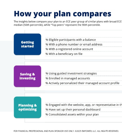 The insights below compare your plan to an ECE peer group of similar plans with broad ECE utilization and a meaningful number of participants for each metric. "Peers" reflect the
