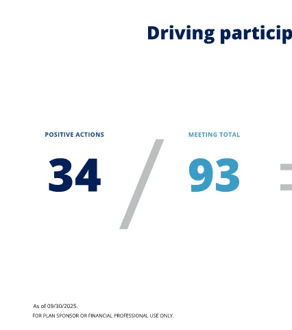 Driving participant outcomes POSITIVE ACTION RATE POSITIVE ACTIONS MEETING TOTAL 34 93 As of 09/30/2025. FOR PLAN SPONSOR OR FINANCIAL PROFESSIONAL USE ONLY.