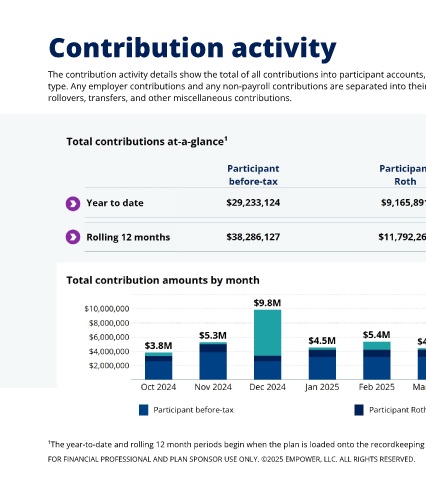 The contribution activity details show the total of all contributions into participant accounts, excluding loan payments. Participant payroll contributions are categorized by their money