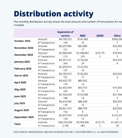 The monthly distribution activity shows the total amount and number of transactions for each distribution reason. All actively employed and separated from service participants are