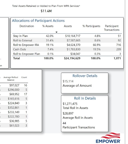 This slide contains the following visuals: slicer ,slicer ,slicer ,slicer ,slicer ,slicer ,slicer ,textbox ,image ,Roll In Details ,Rollover Details ,Top Ten External Destinations ,Plan Details as of: ,Participant Actions ,Allocations of Participant Actions ,Net Assets From WPA Services** ,Total Assets Retained or Added to Plan From WPA Services* ,Money in Motion Report ,textbox ,