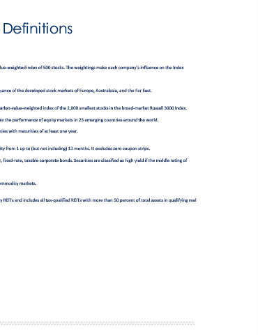 Europe, Australasia, and the Far East. Russell 2000 measures the performance of small capitalization U.S. stocks. The Russell 2000 is a market‐value‐weighted index of the 2,000 smallest stocks in the broad‐market Russell 3000 Index. MSCI Emerging Markets is a Morgan Stanley Capital International Index that is designed to measure the performance of equity markets in 23 emerging countries around the world. includes aged U.S. Treasury bills, notes and bonds with a remaining maturity from 1 up to (but not including) 12 months. It excludes zero coupon strips. Barclays High Yield Bon