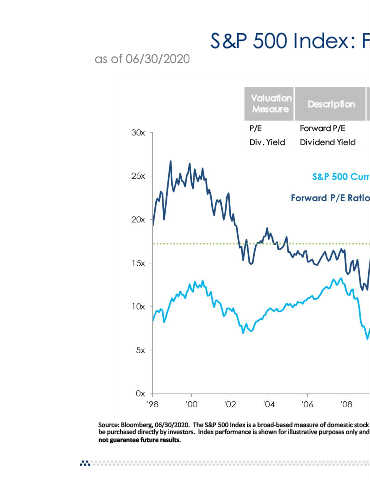 Description 25 Year Average Latest 17.2 24.9 Forward P/E 1.92 2.03 Dividend Yield Source: Bloomberg, 06/30/2020. The S&P 500 Index is a broad‐based measure of domestic stock market performance. The index is unmanaged, includes the reinvestment of dividends, and cannot the performance of any particular investment. Past performance does