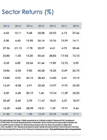 2017 22.98 13.49 -1.01 22.18 22.08 21.03 38.83 23.84 10.85 -1.25 12.11 -4.38 research, portfolio management and asset allocation. The GICS structure consists of 10 sectors. The S&P 500 Index is a broad‐based measure of domestic stock market performance that includes the reinvestment of dividends. The index is unmanaged and cannot be purchased directly by investors. Index performance is shown for illustrative purposes only and does not predict or depict the performance of any particular investment. In Q3 2018 there were changes to GICS sector methodology that re