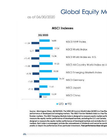 as of 06/30/2020 MSCI Indexes: Total Net Return as of 06/30/2020 * 3-Year, 5-Year, and 10-Year returns are annualized 10-Year* 5-Year* 3-Year* 1-Year 5.73 2.05 0.81 -5.13 9.95 6.90 6.70 2.84 5.43 2.01 0.84 -5.42 4.97 2.26 1.13 -4.80 3.27 2.86 1.90 -3.39 6.07 1.80 -1.30 -2.59 6.09 3.45 2.97 3.10 6.38 5.32 8.55 13.13 Source: Morningstar Direct, 06/30/2020. The MSCI All Country World Index (ACWI) is a free‐float‐adjusted, market‐capitalization‐weighted index that is designed to measure the equity market performance of developed and emerging markets. The MSCI Frontier