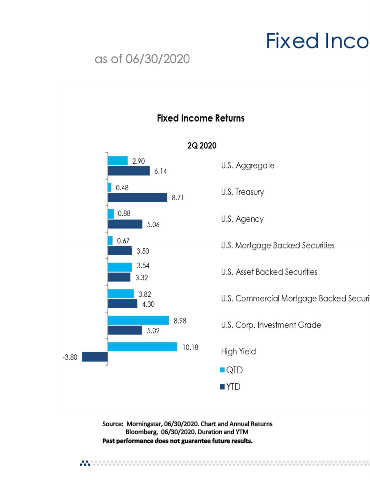 as of 06/30/2020 MSCI Indexes: Total Net Return as of 06/30/2020 * 3 Year, 5 Year, and 10 year returns are annualized YTM Duration 10-Year* 5-Year* 3-Year* 1-Year 1.25 6.04 3.82 4.30 5.32 8.74 0.50 7.15 3.41 4.07 5.57 10.45 1.25 5.98 2.64 3.22 4.21 6.79 1.36 2.07 3.06 3.23 3.97 5.67 0.85 2.11 2.57 2.67 3.34 4.68 1.95 5.26 4.98 4.14 4.90 5.94 2.15 8.54 5.47 5.83 6.34 9.50 6.87 3.90 6.68 4.79 3.33 0.03 Source: Morningstar, 06/30/2020. Chart and Annual Returns Bloomberg, 06/30/2020. Duration and YTM Past performance does not guarantee future results