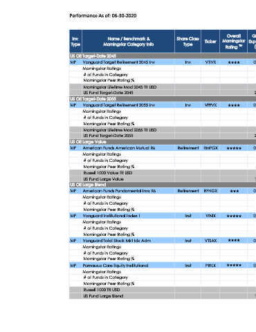 Performance As of: 06‐30‐2020 Name / Benchmark & Inv. Morningstar Category Info Type US OE Target-Date 2045 Vanguard Target Retirement 2045 Inv MF Morningstar Ratings # of Funds in Category Morningstar Peer Rating % Morningstar Lifetime Mod 2045 TR USD US Fund Target-Date 2045 US OE Target-Date 2055 Vanguard Target Retirement 2055 Inv MF Morningstar Ratings # of Funds in Category Morningstar Peer Rating % Morningstar Lifetime Mod 2055 TR USD US Fund Target-Date 2055 US OE Large Value American Funds American Mutual R6 MF Morningstar Ratings # of Funds in Category Morningstar Peer Rating % Russell