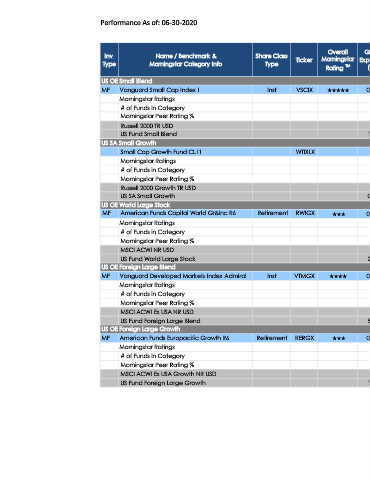 Performance As of: 06‐30‐2020 Name / Benchmark & Inv. Morningstar Category Info Type US OE Small Blend Vanguard Small Cap Index I MF Morningstar Ratings # of Funds in Category Morningstar Peer Rating % Russell 2000 TR USD US Fund Small Blend US SA Small Growth Small Cap Growth Fund CL I1 Morningstar Ratings # of Funds in Category Morningstar Peer Rating % Russell 2000 Growth TR USD US SA Small Growth US OE World Large Stock American Funds Capital World Gr&Inc R6 MF Morningstar Ratings # of Funds in Category Morningstar Peer Rating % MSCI ACWI NR USD US Fund World Large Stock US OE Foreign Large