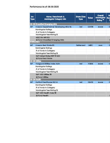 Performance As of: 06‐30‐2020 Name / Benchmark & Inv. Morningstar Category Info Type US OE Diversified Emerging Mkts Invesco Oppenheimer Developing Mkts R6 MF Morningstar Ratings # of Funds in Category Morningstar Peer Rating % MSCI EM NR USD US Fund Diversified Emerging Mkts US OE Real Estate Invesco Real Estate R5 MF Morningstar Ratings # of Funds in Category Morningstar Peer Rating % S&P United States REIT TR USD US Fund Real Estate US OE Utilities Vanguard Utilities Index Adm MF Morningstar Ratings # of Funds in Category Morningstar Peer Rating % S&P 1500 Utilities TR US Fund Utilities US