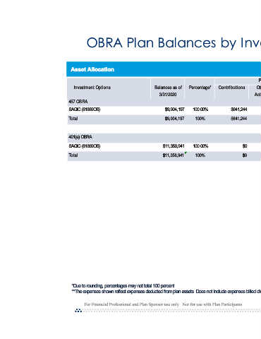 Other Percentage* Balances as of Investment Expenses** Distributions Transfers 6/30/2020 Income Activity 100.00% $10,455,475 $36,404 ($1,386) ($125,388) $0 $404 100% $10,455,475 $36,404 ($1,386) ($125,388) ---- $404 100.00% $11,193,717 $40,410 ($1,557) ($202,077) $0 $0 100% $11,193,717 $40,410 ($1,557) ($202,077) ---- $0 plan assets. Does not include expenses billed directly to the plan sponsor or expenses related to the expense ratio of investments under the plan. RS-41492-03 8
