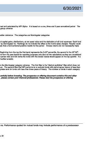 The following pages contain fund information including a peer return rank. These ranks are all owned and calculated by MPI Stylus. It is based on a one, three and 5 year annualized period. The