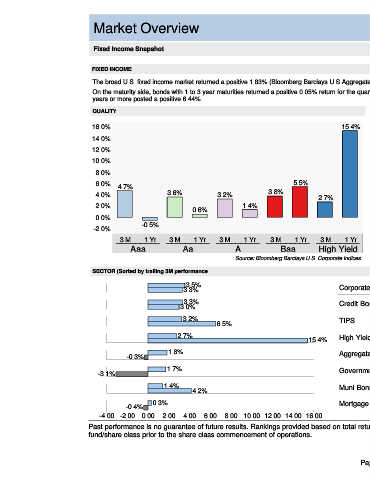 On the maturity side, bonds with 1 to 3 year maturities returned a positive 0.05% return for the quarter. Bonds with 5 to 7 year duration returned a positive 1.12%, while bonds with maturities of 10