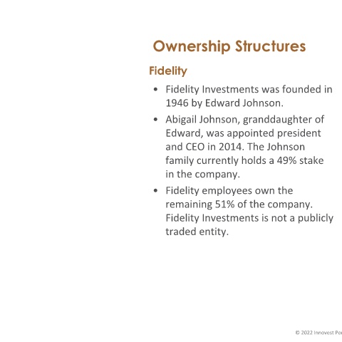 in the company. •The company is owned by its funds, which are then owned by Fidelity employees own the shareholders. There are no outside remaining 51% of the company. investors apart from the Fidelity Investments is not a publicly shareholders, which has traded entity. contributed to the low management fees the firm offers. 13 © 2022 Innovest Portfolio Solutions, LLC