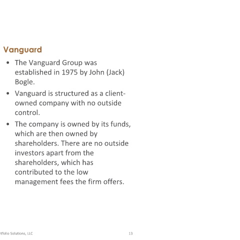 Vanguard •The Vanguard Group was established in 1975 by John (Jack) Bogle. Vanguard is structured as a client‐ • owned company with no outside control. •The company is owned by its funds, which are then owned by shareholders. There are no outside investors apart from the shareholders, which has contributed to the low management fees the firm offers. © 2022 Innovest Portfolio Solutions, LLC