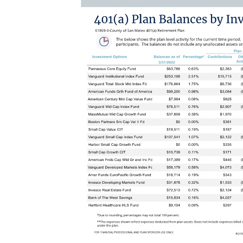 The below shows the plan level activity for the current time period. The balances are based on all activity employed and terminated plan