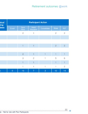 Retirement outcomes idual Participant Action ting dees Enroll Save Asset Consolidate TRAK RST More Allocation 2 2 2 2 1 2 11 22 2 21 1 11 6 32 1 56 1 11 11 2 11 1 12 5 0 10 7 3 12 14 nly – Not for Use with Plan Participants 22 22