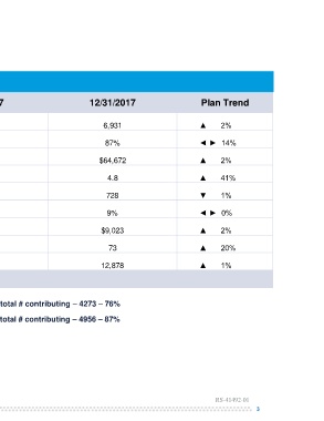 7 12/31/2017 Plan Trend 6,931 ▲ 2% 87% ◄ ► 14% $64,672 ▲ 2% 4.8 ▲ 41% 728 ▼ 1% 9% ◄ ► 0% $9,023 ▲ 2% 73 ▲ 20% 12,878 ▲ 1% total # contributing – 4273 – 76% total # contributing – 4956 – 87% RS-41492-01 3