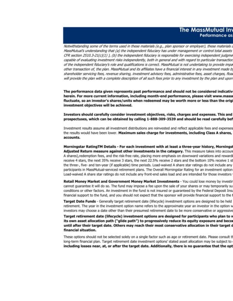 Performance as of 12/31/2019 The MassMutual Investment Program Notwithstanding some of the terms used in these materials (e.g., plan sponsor or employer), these materials are directed to and are intended for use by the referenced plan’s independent fiduciary adviser based on MassMutual’s understanding that (a) the independent fiduciary has under management or control total assets of at least $50 million, or is a broker-dealer, investment adviser, insurance carrier, or bank, as defined in 29 CFR section 2510.3-21(c)(1) ), (b) the independent fiduciary is responsible for exercising independent judgment in