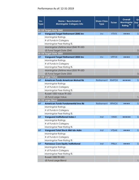 Performance As of: 12‐31‐2019 Name / Benchmark & Inv. Morningstar Category Info Type US OE Target-Date 2045 Vanguard Target Retirement 2045 Inv MF Morningstar Ratings # of Funds in Category Morningstar Peer Rating % Morningstar Lifetime Mod 2045 TR USD US Fund Target-Date 2045 US OE Target-Date 2055 Vanguard Target Retirement 2055 Inv MF Morningstar Ratings # of Funds in Category Morningstar Peer Rating % Morningstar Lifetime Mod 2055 TR USD US Fund Target-Date 2055 US OE Large Value American Funds American Mutual R6 MF Morningstar Ratings # of Funds in Category Morningstar Peer Rating % Russell