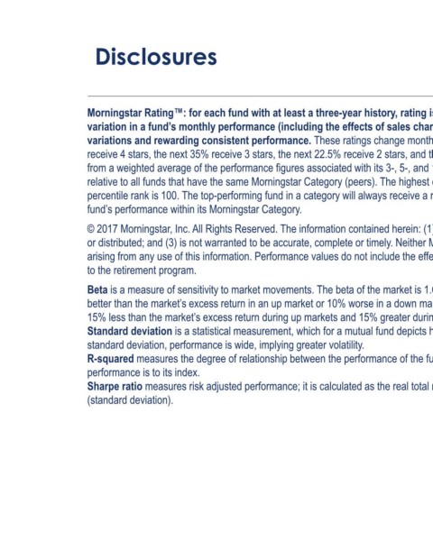 Disclosures Morningstar Rating™: for each fund with at least a three-year history, rating is based on a Morningstar risk adjusted return measure that accounts for variation in a fund’s monthly performance (including the effects of sales charges, loads, and redemption fees), placing more emphasis on downward variations and rewarding consistent performance. These ratings change monthly. The top 10% of funds in an investment category receive 5 stars, the next 22.5% receive 4 stars, the next 35% receive 3 stars, the next 22.5% receive 2 stars, and the bottom 10% receive 1 star. The Overall Morningstar Ra