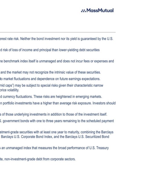 Disclosures government. investments. cannot be purchased directly for investment. Investments in companies with small or mid market capitalization (“small caps” or “mid caps”) may be subject to special risks markets, limited financial resources, and less liquid stocks, all of which may cause price volatility. consider their risk tolerance carefully before choosing such a strategy. An investment with multiple underlying investments may be subject to the expenses of those underlying investments in addition of principal. The Barclays U.S. Aggregate Bond Index is an unmanaged index of fixed-rate in