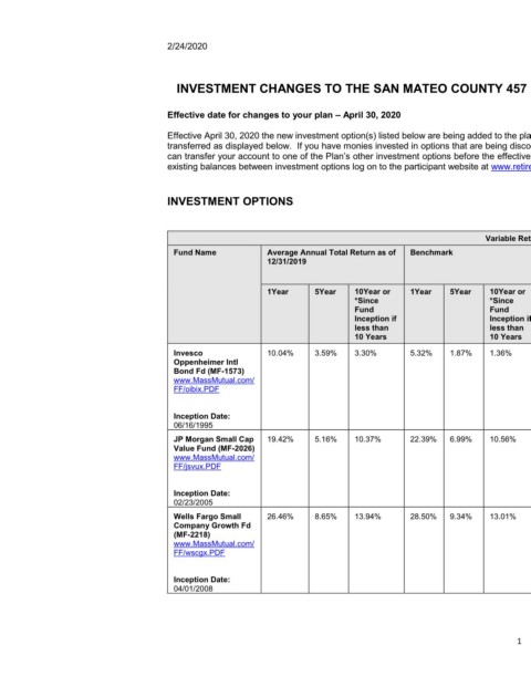 INVESTMENT CHANGES TO THE SAN MATEO COUNTY 457 DEFERRED COMPENSATION & 401(A) RETIREMENT PLANS
