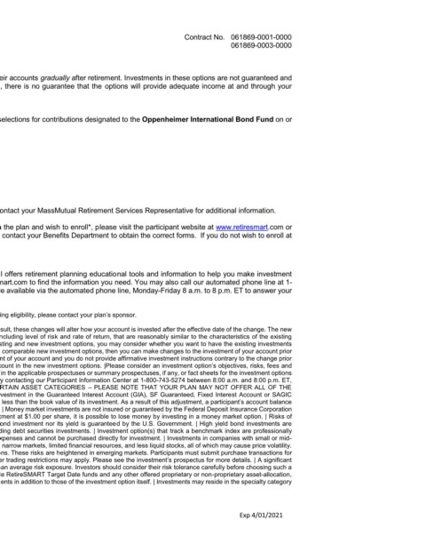 may be either increased or decreased if the plan fully or partially terminates the contract with MassMutual. | Money market investments are not insured or guaranteed by the Federal Deposit Insurance Corporation