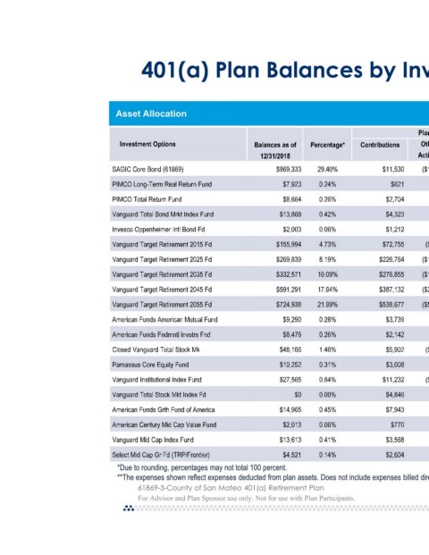 expenses deducted from plan assets. Does not include expenses billed directly to the plan sponsor or expenses related to the expense ratio of investments under the plan. 61869-3-County of San Mateo 401(a) Retirement Plan RS-41492-03 For Advisor and Plan Sponsor use only. Not for use with Plan Participants. 6