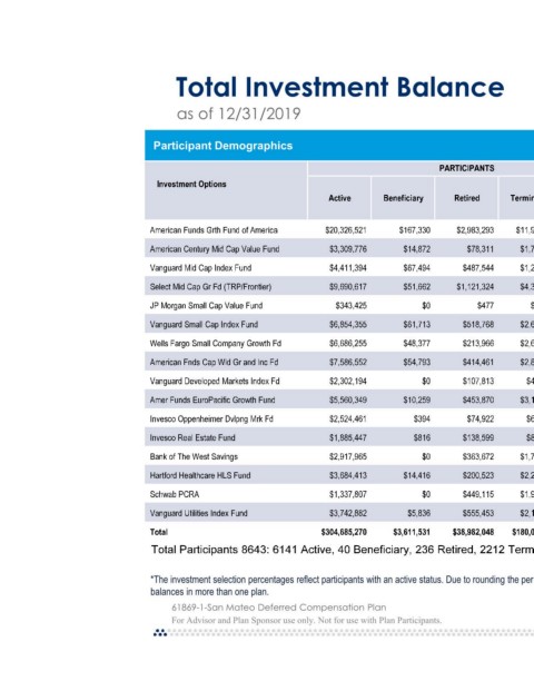 as of 12/31/2019 Participant Demographics *The investment selection percentages reflect participants with an active status. Due to rounding the percentages may not total 100% Contracts with multiple plans may result in participants maintaining balances in more than one plan. 61869-1-San Mateo Deferred Compensation Plan RS-41492-03 For Advisor and Plan Sponsor use only. Not for use with Plan Participants. 10