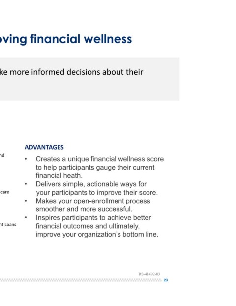 ADVANTAGES • to help participants gauge their current financial heath. Delivers simple, actionable ways for • Makes your open-enrollment process • smoother and more successful. Inspires participants to achieve better • financial outcomes and ultimately, •