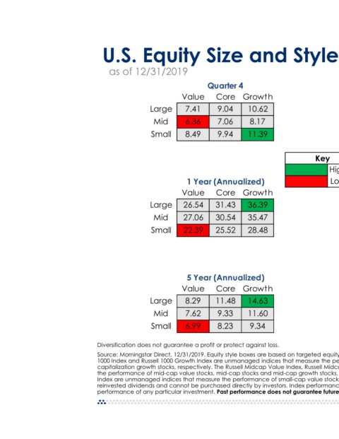 Key Highest Lowest 3 Year (Annualized) Growth Core Value 20.49 15.05 9.68 Large 17.36 12.06 8.10 Mid 12.49 8.59 4.77 Small 10 Year (Annualized) Growth Core Value 15.22 13.54 11.80 Large 14.24 13.19 12.41 Mid 13.01 11.83 10.56 Small Source: Morningstar Direct, 12/31/2019. Equity style boxes are based on targeted equity styles as determined by valuation measures. The Russell 1000 Value Index, Russell 1000 Index and Russell 1000 Growth Index are unmanaged indices that measure the performance of large-capitalization value stocks, large-c