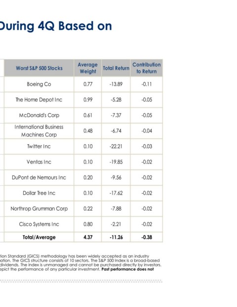 Contribution to Return 1.21 0.59 0.30 0.29 0.27 0.21 0.19 0.19 0.16 0.15 3.56 Source of chart data: Morningstar Direct, 12/31/2019. The Global Industry Classification Standard (GICS) methodology has been widely accepted as an industry analysis framework for investment research, portfolio management and asset allocation. The GICS structure consists of 10 sectors. The S&P 500 Index is a broad-based measure of domestic stock market performance that includes the reinvestment of dividends. The index is unmanaged and cannot be purchased directly by investors. Index perform