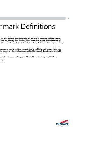 17 Disclosures and Benchmark Definitions The opinions expressed herein are subject to change. The opinions are not investment advice, and should not be relied on as such. The information presented in this report was Great-West Life & Annuity Insurance Company developed internally and/or obtained from sources believed to be reliable; however, GWFS Equities, Inc., and its parent company, (GWL&A), do not guarantee the accuracy, adequacy, or completeness of such information. Predictions, opinions, and other information contained in this report are subject to change continually and without notice of any kind and may no longer be true after the date indicated. Any forward-looking statements speak only as of the date they are made. GWFS Equities, Inc. assumes no duty to and does not undertake to update forward-looking stateme