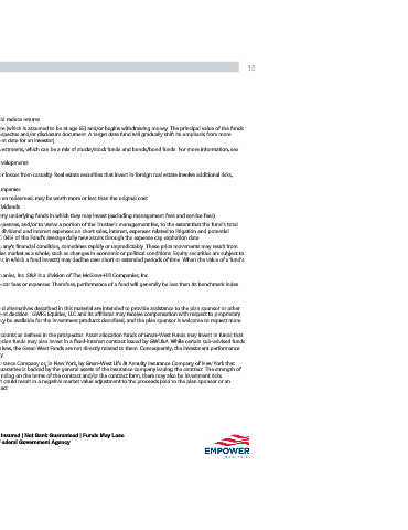 to be at age 65) and/or begins withdrawing money. The principal value of the funds a mix of stocks/stock funds and bonds/bond funds. For more information, see be worth more or less than the original cost. a portion of the Trustee’s management fee, to the extent that the fund’s total whole, such as changes in economic or political conditions. Equity securities are subject to Therefore, performance of a fund will generally be less than its benchmark index. Equities, LLC and its affiliates may receive compensation with respect to proprietary investment products described, and the plan sponsor is welcome to request more the prospectus. Asset allocation funds of Great-West Funds may invest in funds that York, by Great-West Life & Annuity Insurance Company of New York that by the general assets of the