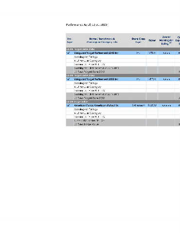 Name / Benchmark & Morningstar Category Info Vanguard Target Retirement 2045 Inv Morningstar Lifetime Mod 2045 TR USD Vanguard Target Retirement 2055 Inv Morningstar Lifetime Mod 2055 TR USD American Funds American Mutual R6
