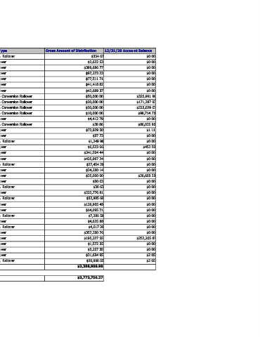 Payee Type 12/31/20 Account Balance Gross Amount of Distribution $43,405.87 $230,000.00 457(b) Plan to Plan Transfer $7,528.65 $56,078.58 457(b) Plan to Plan Transfer $7,528.65 $13,783.91 457(b) Plan to Plan Transfer $7,528.65 $13,783.91 457(b) Plan to Plan Transfer $12,554.30 $11,424.58 457(b) Plan to Plan Transfer $103,730.83 $10,619.03 457(b) Plan to Plan Transfer $61,657.11 $10,567.52 457(b) Plan to Plan Transfer $274.18 $8,300.00 457(b) Plan to Plan Transfer $23,386.70 $5,900.00 457(b) Plan to Plan Transfer $68,045.84 $5,318.79 457(b) Plan to Plan Transfer $141,581.85 $4,892.75 457(b) Plan to Plan Transfer $6,239.68 $3,613.25 457(b) Plan to Plan Transfer $236,698.06 $3,020.49 457(b) Plan to Plan Transfer $46,860.99 $2,820.32 457(b) Plan to Plan Transfer $2,173.96 $1,768.55 457(b) Plan to P