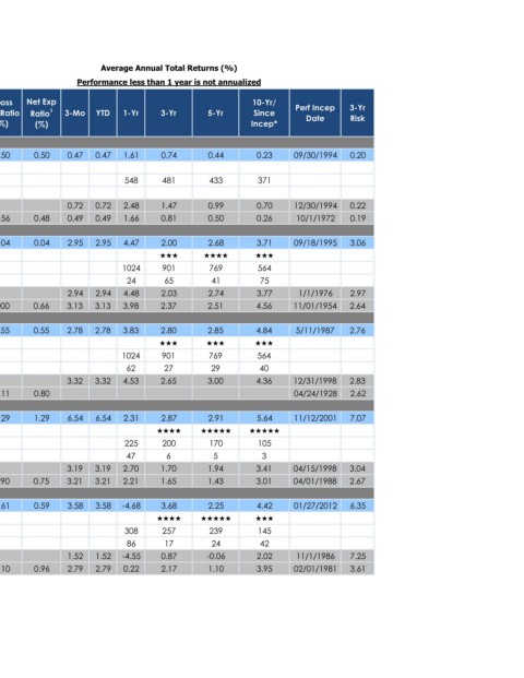 Average Annual Total Returns (%) Performance less than 1 year is not annualized 5-Yr 3-Yr 1-Yr 0.44 0.74 1.61 433 481 548 0.99 1.47 2.48 0.50 0.81 1.66 2.68 2.00 4.47 ★★★★ ★★★ 769 901 1024 41 65 24 2.74 2.03 4.48 2.51 2.37 3.98 2.85 2.80 3.83 ★★★ ★★★ 769 901 1024 29 27 62 3.00 2.65 4.53 2.91 2.87 2.31 ★★★★★ ★★★★ 170 200 225 5 6 47 1.94 1.70 2.70 1.43 1.65 2.21 2.25 3.68 -4.68 ★★★★★ ★★★★ 239 257 308 24 17 86 -0.06 0.87 -4.55 1.10 2.17 0.22