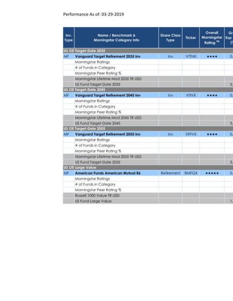 Performance As of: 03‐29‐2019 Name / Benchmark & Inv. Morningstar Category Info Type US OE Target-Date 2035 Vanguard Target Retirement 2035 Inv MF Morningstar Ratings # of Funds in Category Morningstar Peer Rating % Morningstar Lifetime Mod 2035 TR USD US Fund Target-Date 2035 US OE Target-Date 2045 Vanguard Target Retirement 2045 Inv MF Morningstar Ratings # of Funds in Category Morningstar Peer Rating % Morningstar Lifetime Mod 2045 TR USD US Fund Target-Date 2045 US OE Target-Date 2055 Vanguard Target Retirement 2055 Inv MF Morningstar Ratings # of Funds in Category Morningstar Peer Rating % M